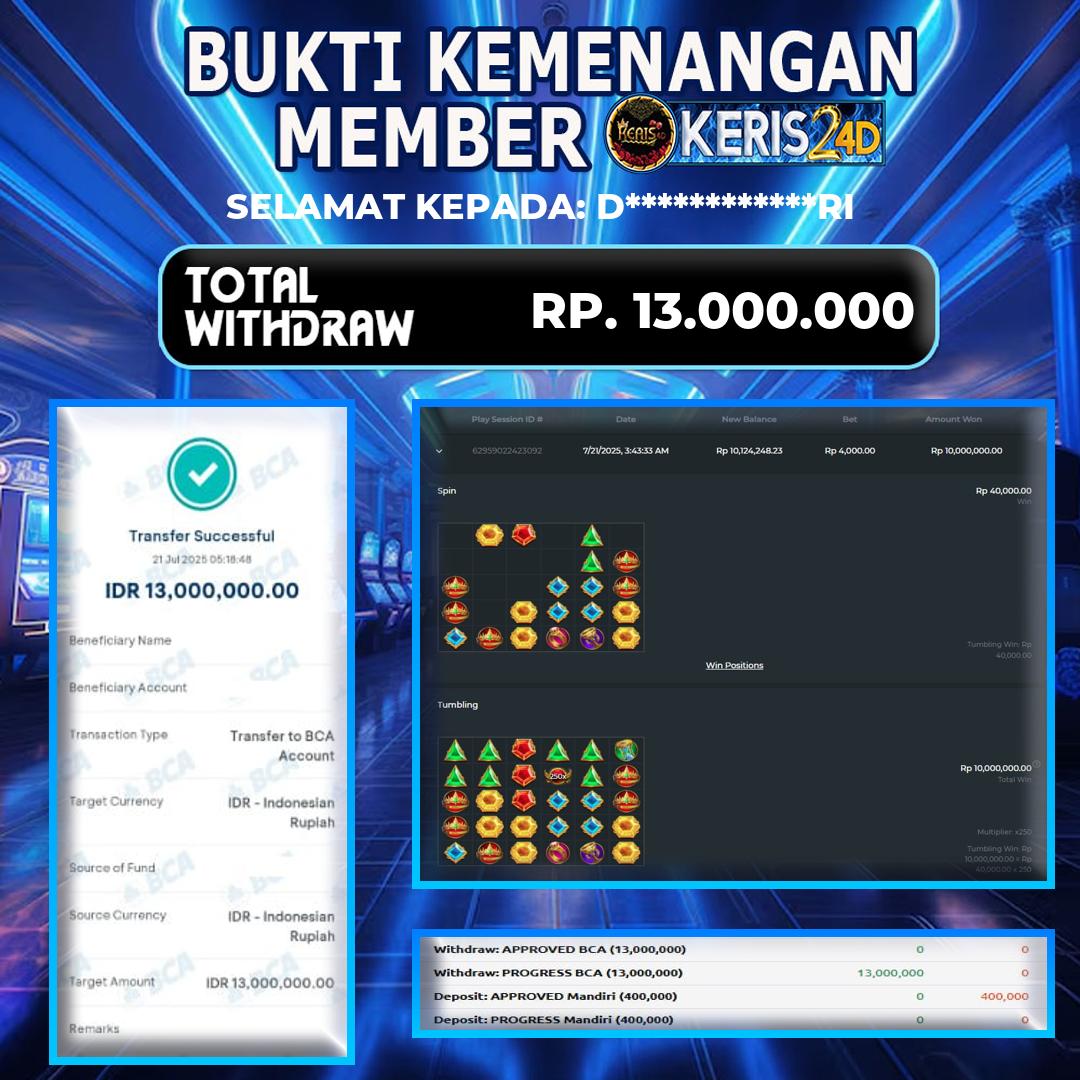 Setiap hari, member KERIS24D berhasil meraih jackpot besar dari berbagai provider slot ternama yang kami sediakan, seperti Pragmatic Play, Habanero, PG Soft, dan masih banyak lagi. Kami secara rutin menampilkan bukti screenshot atau rekapan kemenangan yang berhasil diraih, mulai dari kemenangan ratusan ribu hingga puluhan juta rupiah. Semua slip kemenangan ini kami hadirkan untuk membuktikan bahwa di KERIS24D, peluang menang itu nyata.