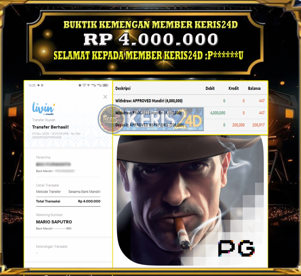 Setiap hari, member KERIS24D berhasil meraih jackpot besar dari berbagai provider slot ternama yang kami sediakan, seperti Pragmatic Play, Habanero, PG Soft, dan masih banyak lagi. Kami secara rutin menampilkan bukti screenshot atau rekapan kemenangan yang berhasil diraih, mulai dari kemenangan ratusan ribu hingga puluhan juta rupiah. Semua slip kemenangan ini kami hadirkan untuk membuktikan bahwa di KERIS24D, peluang menang itu nyata.
