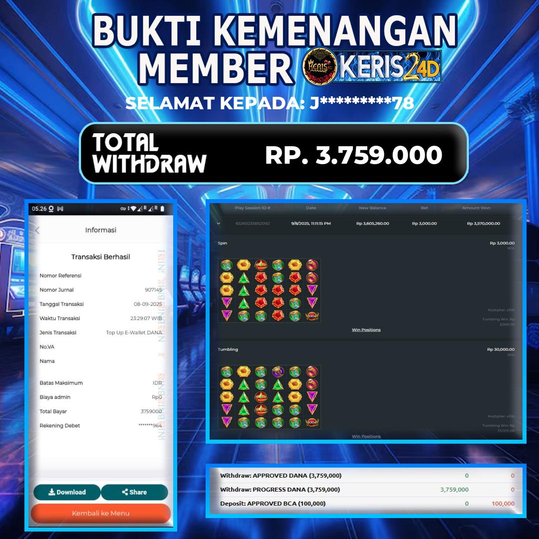Setiap hari, member KERIS24D berhasil meraih jackpot besar dari berbagai provider slot ternama yang kami sediakan, seperti Pragmatic Play, Habanero, PG Soft, dan masih banyak lagi. Kami secara rutin menampilkan bukti screenshot atau rekapan kemenangan yang berhasil diraih, mulai dari kemenangan ratusan ribu hingga puluhan juta rupiah. Semua slip kemenangan ini kami hadirkan untuk membuktikan bahwa di KERIS24D, peluang menang itu nyata.